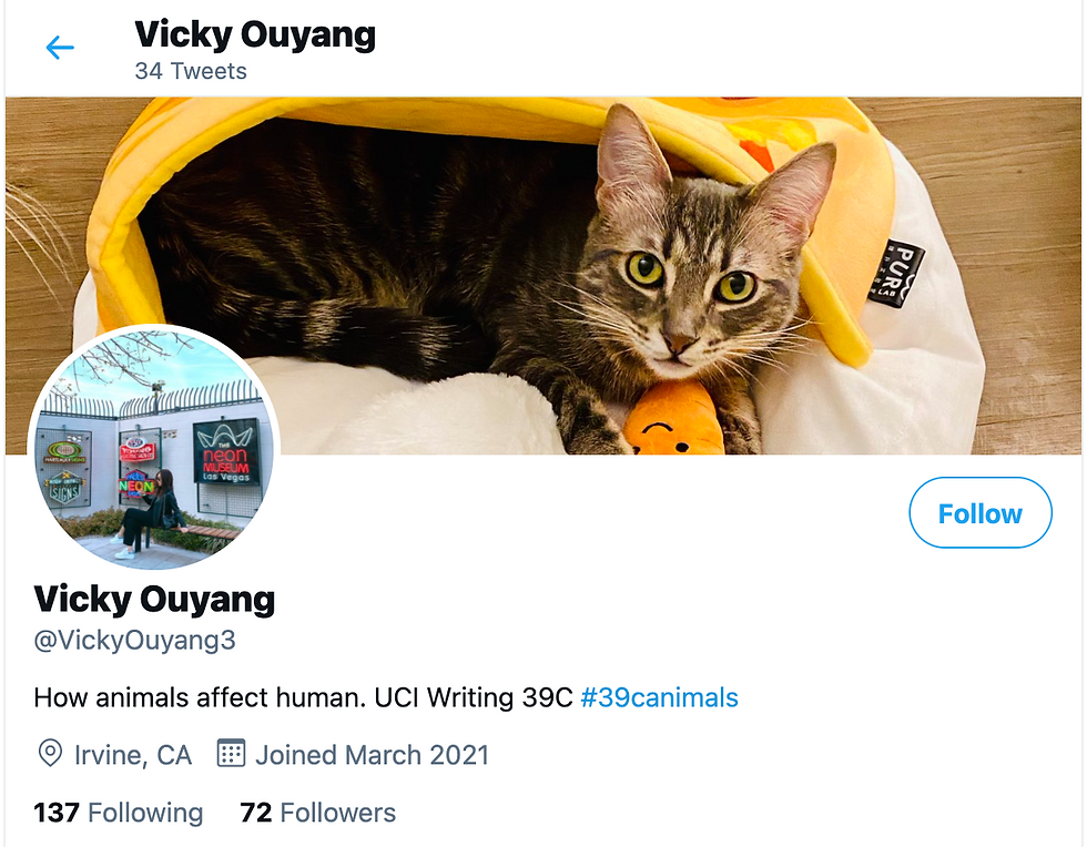 I feel like most of us retweet things that interest us or interesting content. However, for tweets, most of us either choose original stuff or articles from authority websites. Most tweets I commented on are either adorable kittens or interesting things, definitely not academically. I also found out that when I follow an organization, Twitter will automatically list other related organizations as well as researchers in the same field for me. This makes it easier for me to search for organizations and researchers, and I don't need to type in every researcher's name on my own. Overall, with more familiarity with Twitter features, I feel better and more confident with this quarter and Writing 39C course.